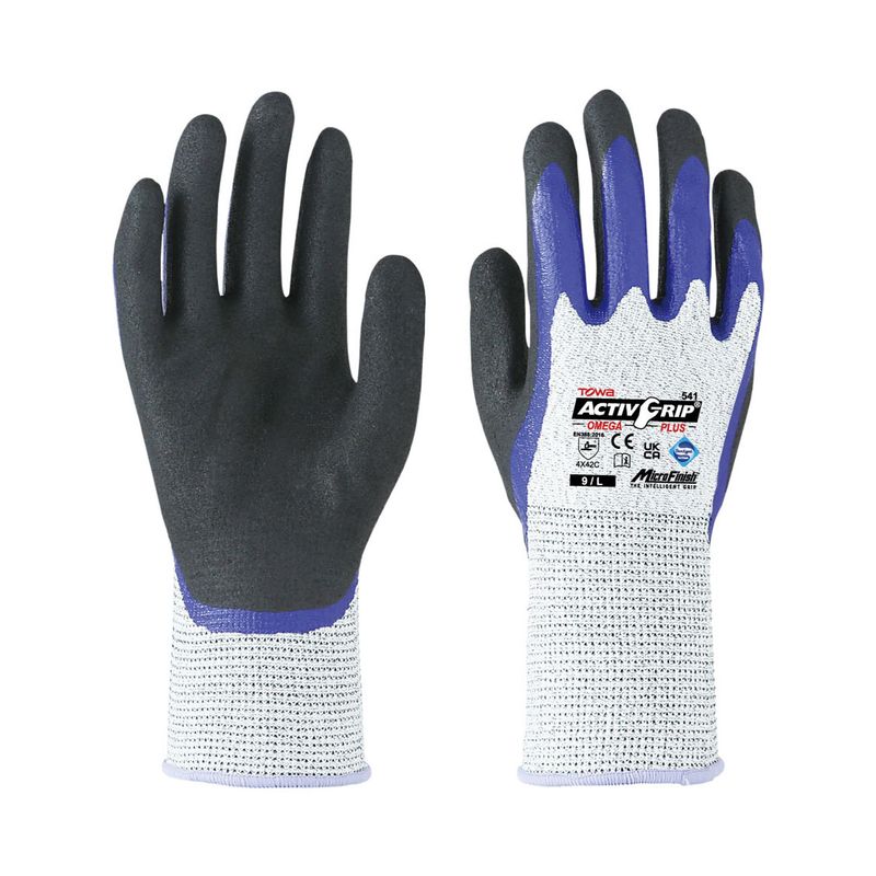 El guante anticorte Towa Omega Plus 541 es ideal para trabajos que requieren alta destreza, protección contra cortes y máximo agarre en condiciones exigentes. Su forro de HPPE calibre 13 sin costuras proporciona resistencia al corte nivel ANSI A3 / ISO Cut C, manteniendo la ligereza y comodidad durante toda la jornada. Cuenta con recubrimiento de nitrilo en palma y dedos, lo que protege frente a la penetración de aceites y líquidos, manteniendo la transpirabilidad en el dorso. Incorpora tecnología MicroFinish® exclusiva de Towa, que asegura excelente agarre en entornos húmedos, secos o aceitosos.