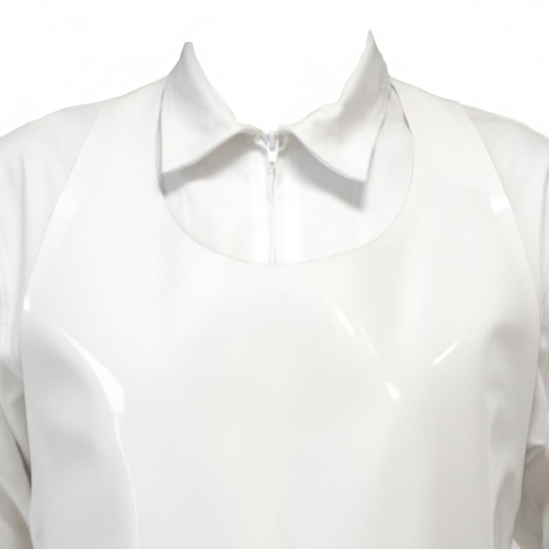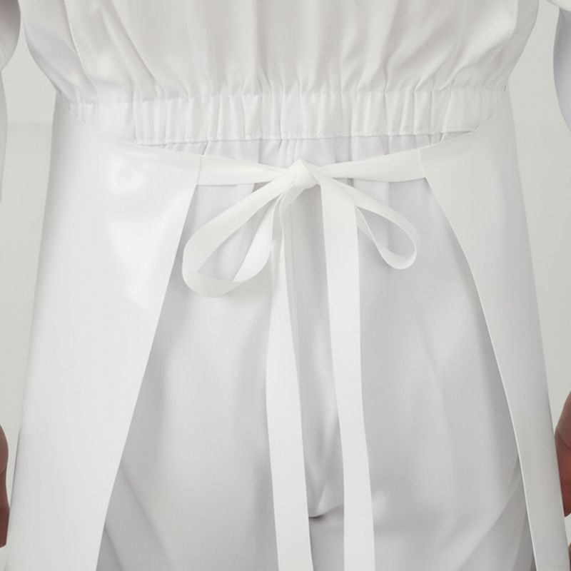 100% poliuretano, esta pechera combina flexibilidad, resistencia a productos químicos y una superficie lisa que facilita la limpieza y desinfección. Su composición sin costuras garantiza mayor durabilidad frente al desgaste diario y a los lavados constantes.